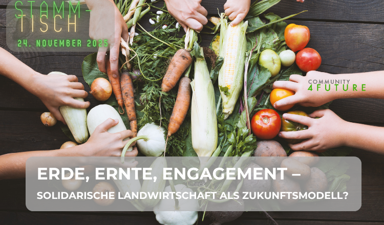 C4F-Stammtisch: Erde, Ernte, Engagement - Solawi als Zukunftsmo… | Montag, 24. Nov. 2025 - 17:30 Uhr - 18:30 Uhr | Die Veranstaltung findet online statt. (Zoom) | Mehr |